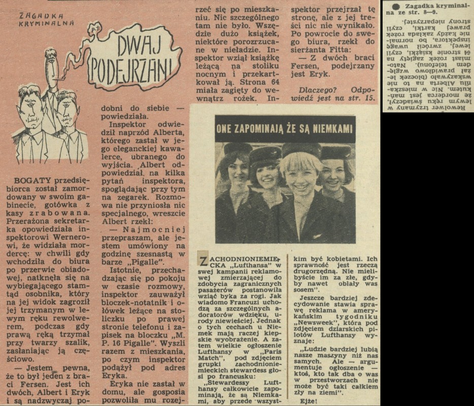 Archiwum / Zagadka kryminalna nr 1130 (49/1966) 1/1 Podziel się Tytuł Dwaj podejrzani Rubryka Zagadka kryminalna Artykuł z numeru 1130 (49/1966) Data wydania 4 grudnia 1966
