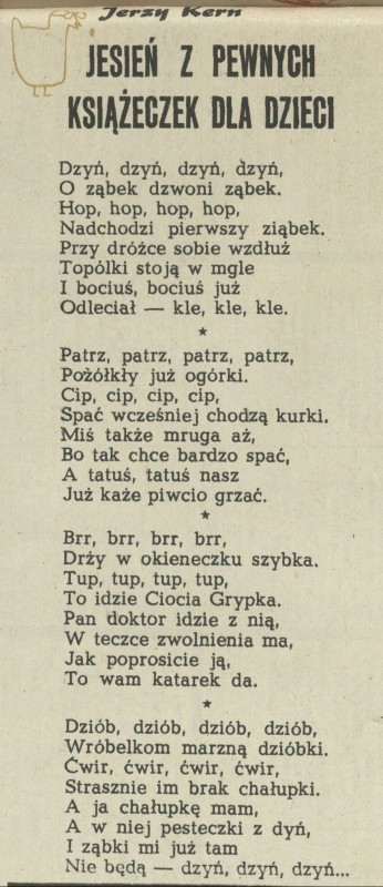 Archiwum / Rozmaitości [old] nr 968 (43/1963) 127/408 Podziel się Tytuł Jesień z pewnych książeczek dla dzieci Autor Ludwik Jerzy Kern Rubryka Rozmaitości [old] Artykuł z numeru 968 (43/1963) Data wydania 27 października 1963 Tagi Ludwik Jerzy Kern wiersz rozmaitości