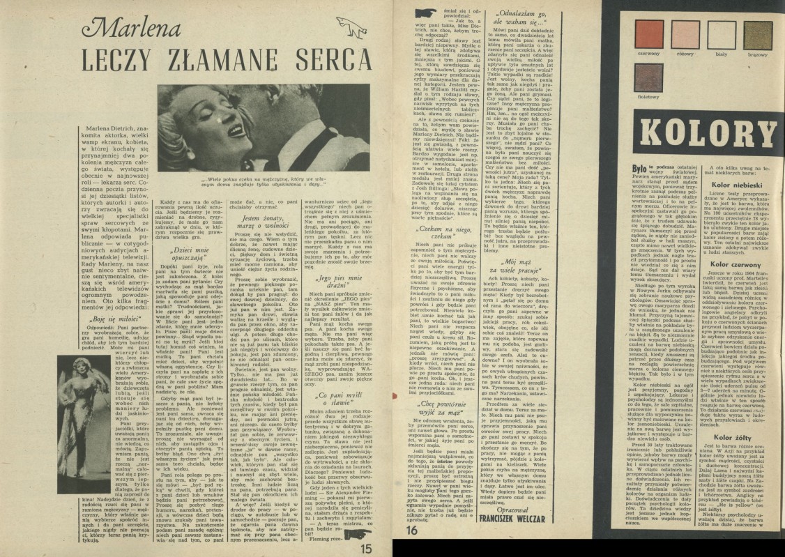 Archiwum / Wywiad nr 751 (35/1959) 30794/123969 Podziel się Tytuł Marlena leczy złamane serca Autor Franciszek Welczar Kategoria Wywiad Artykuł z numeru 751 (35/1959) Data wydania 30 sierpnia 1959 Tagi Marlena Dietrich