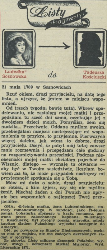 Archiwum / Listy sławnych ludzi nr 1398 (04/1972) 2/4 Podziel się Tytuł [Listy] Rubryka Listy sławnych ludzi Artykuł z numeru 1398 (4/1972) Data wydania 23 stycznia 1972 Tagi Ludwika Sosnowska Tadeusz Kościuszko