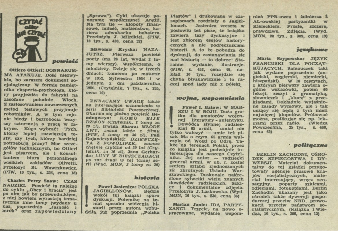 Archiwum / Czytać albo nie czytać? nr 969 (44/1963) 09/47 Podziel się Tytuł Czytać nie czytać Rubryka Czytać albo nie czytać? Artykuł z numeru 969 (44/1963) Data wydania 3 listopada 1963 Tagi Paweł Jasienica recenzje