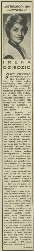 Archiwum / Astrologia dla wszystkich nr 777 (09/1960) 07/34 Podziel się Tytuł Irena Dziedzic Autor Ryszard Lassota Rubryka Astrologia dla wszystkich Artykuł z numeru 777 (9/1960) Data wydania 28 lutego 1960 Tagi aktorka gwiazdy filmowe kino