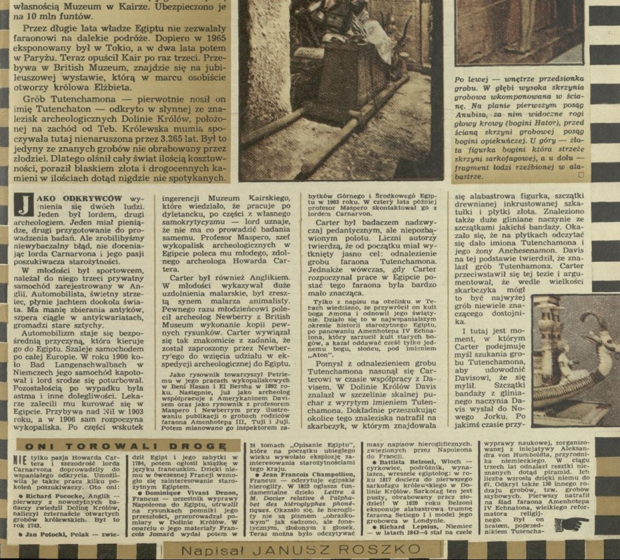 Archiwum / Felieton nr 1401 (07/1972) 2/2 Podziel się Tytuł Tutenchamon Autor Janusz Roszko Kategoria Felieton Artykuł z numeru 1401 (7/1972) Data wydania 13 lutego 1972 Tagi Tutenchamon Dolina Królów faraon mumia Egipt Howard Carter lord Carnarvon
