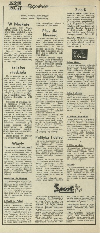 Archiwum / Przekrój tygodnia nr 721 (05/1959) 1009/3219 Podziel się Tytuł Przekrój tygodnia Rubryka Przekrój tygodnia Artykuł z numeru 721 (5/1959) Data wydania 1 lutego 1959 Tagi Moskwa szkoła Chruszczow Niemcy nekrologi