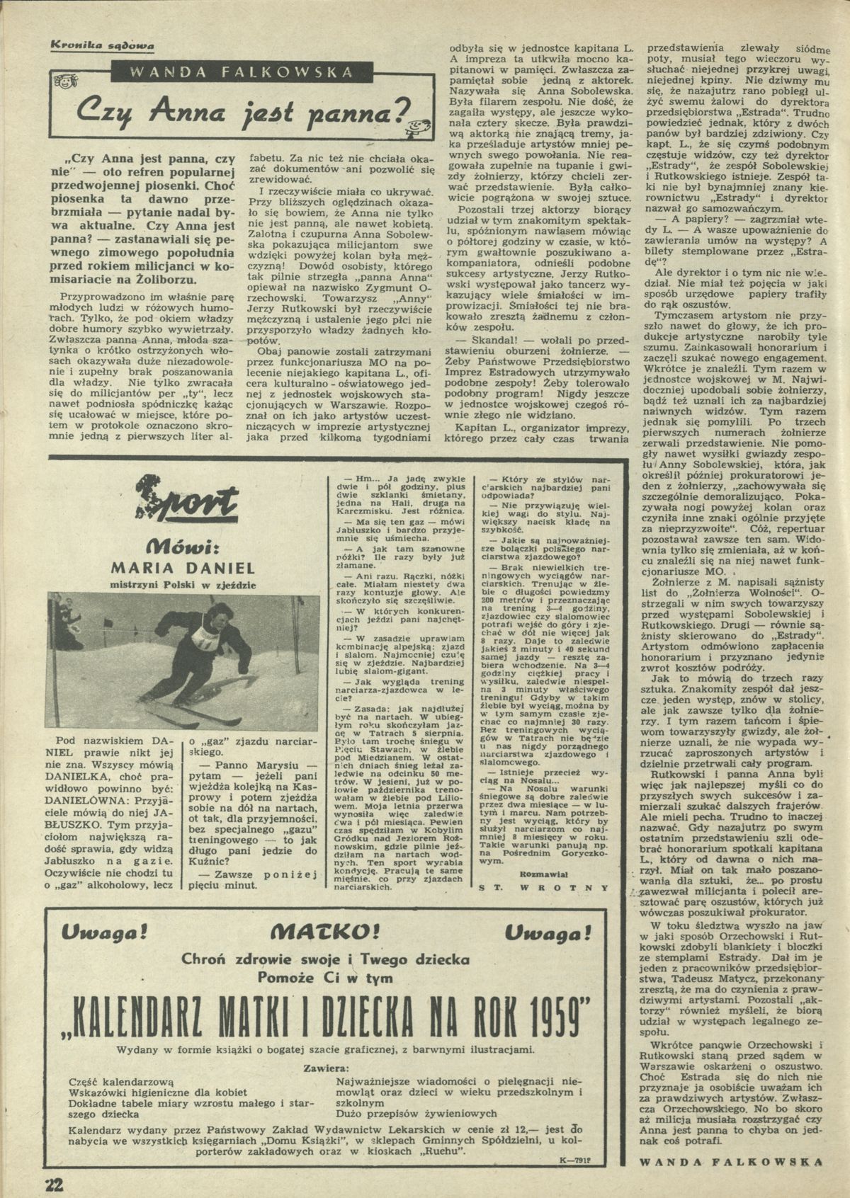 Archiwum / Kronika sądowa nr 720 (04/1959) 28/29 Podziel się Tytuł Czy Anna jest panna? Autor Wanda Falkowska Rubryka Kronika sądowa Artykuł z numeru 720 (4/1959) Data wydania 25 stycznia 1959 Tagi prawo