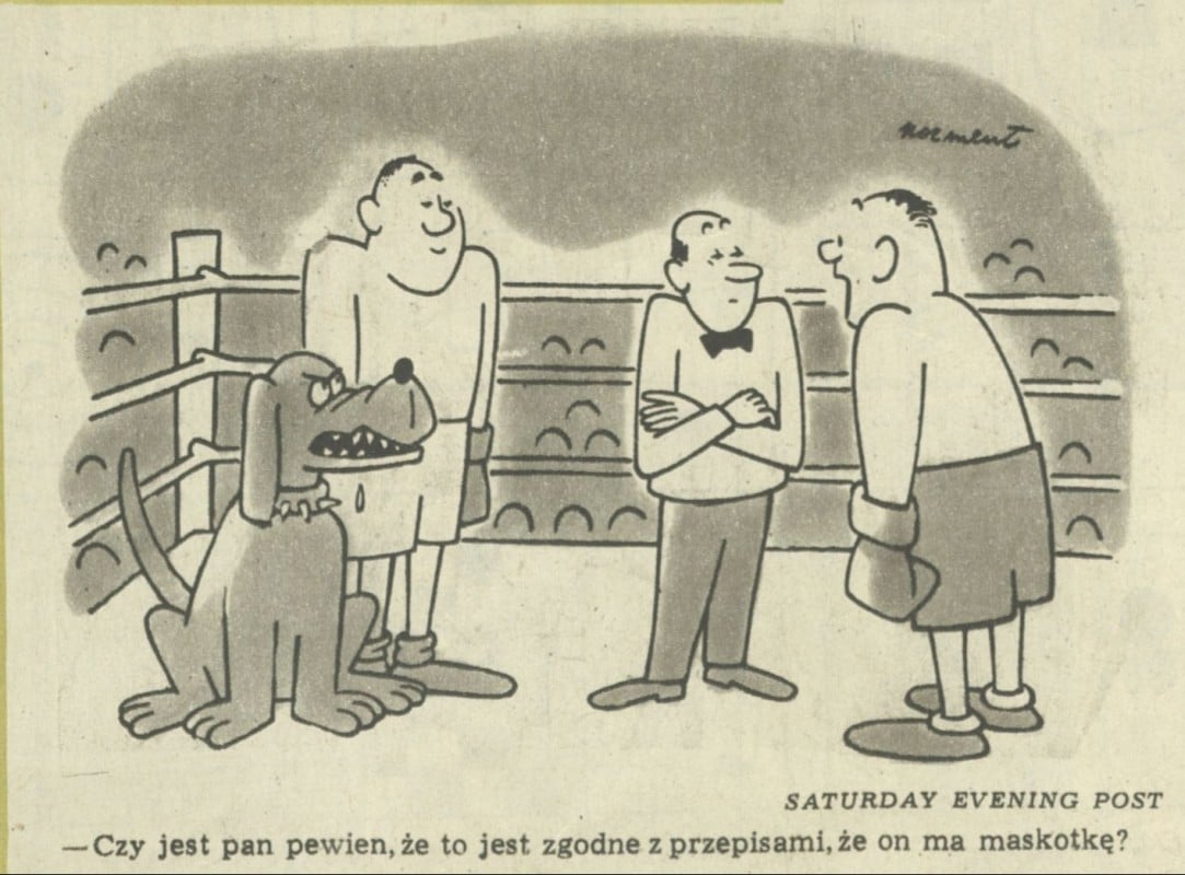 Archiwum / Rozmaitości [old] nr 721 (05/1959) 1/1 Podziel się Tytuł - Czy jest pan pewien, że to jest zgodne z przepisami, że on ma maskotkę? Autor Saturday Evening Post Rubryka Rozmaitości [old] Artykuł z numeru 721 (5/1959) Data wydania 1 lutego 1959 Tagi żart rysunkowy humor amerykański boks ring pies