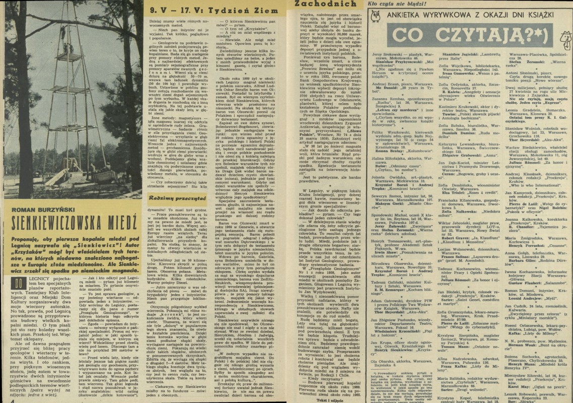 Archiwum / Artykuł nr 735 (19/1959) 30021/123969 Podziel się Tytuł Sienkiewiczowska miedź Autor Roman Burzyński Kategoria Artykuł Artykuł z numeru 735 (19/1959) Data wydania 10 maja 1959 Tagi Sienkiewicz kopalnia miedzi Legnica