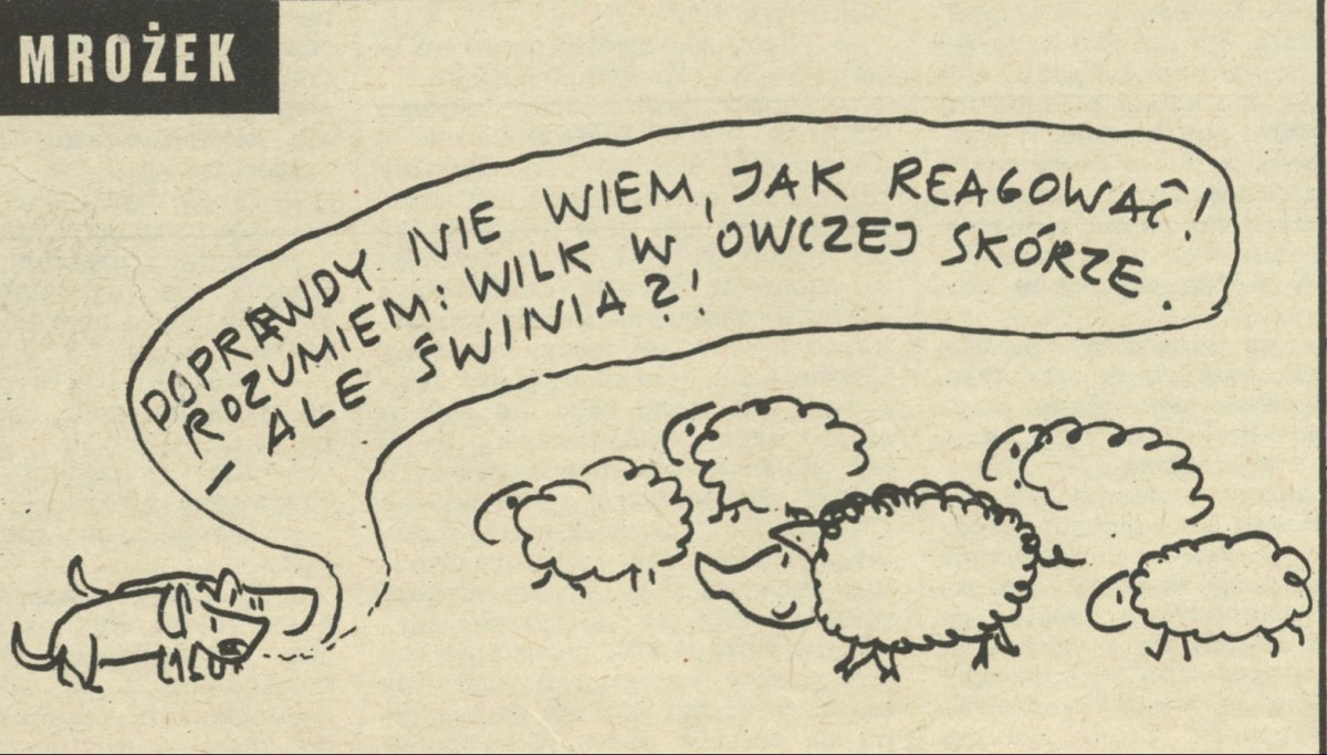 Archiwum / Przez okulary Sławomira Mrożka nr 1168 (35/1967) 33/48 Podziel się Tytuł Wilk w owczej skórze Autor Sławomir Mrożek Rubryka Przez okulary Sławomira Mrożka Artykuł z numeru 1168 (35/1967) Prawa Diogenes Verlag AG Data wydania 27 sierpnia 1967 Tagi satyra absurd żart rysunkowy świnia