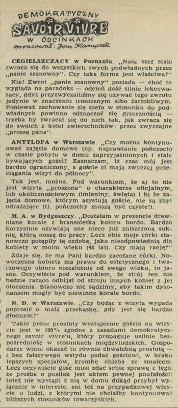 Archiwum / Demokratyczny savoir-vivre nr 248 (02/1950) 05/2491 Podziel się Tytuł Demokratyczny savoir-vivre Autor Jan Kamyczek Rubryka Demokratyczny savoir-vivre Artykuł z numeru 248 (2/1950) Data wydania 8 stycznia 1950