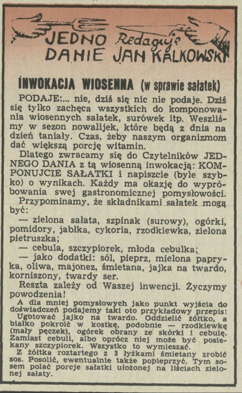 Archiwum / Jedno danie nr 997 (20/1964) 74/232 Podziel się Tytuł Inwokacja wiosenna (w sprawie sałatek) Autor Jan Kalkowski Rubryka Jedno danie Artykuł z numeru 997 (20/1964) Data wydania 17 maja 1964 Tagi gastronomia kulinaria przepis kulinarny sałatki warzywa