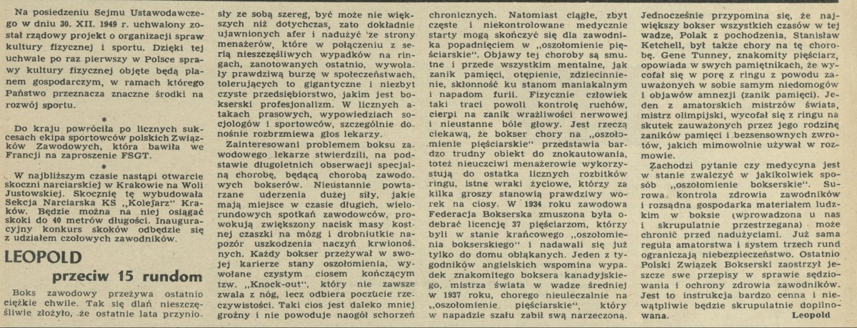 Archiwum / Sport nr 248 (02/1950) 7704/123969 Podziel się Tytuł Leopold przeciw 15 rundom Autor Leopold Rubryka Sport Artykuł z numeru 248 (2/1950) Data wydania 8 stycznia 1950 Tagi boks