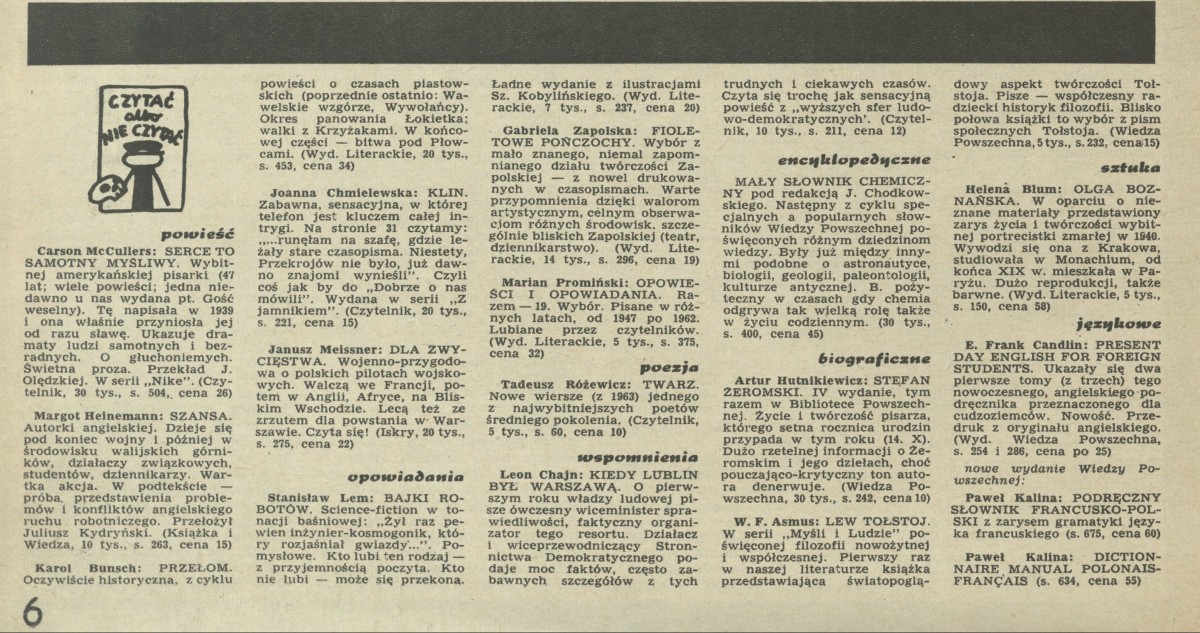 Archiwum / Czytać albo nie czytać? nr 1012 (35/1964) 21/59 Podziel się Tytuł Czytać albo nie czytać? Rubryka Czytać albo nie czytać? Artykuł z numeru 1012 (35/1964) Data wydania 30 sierpnia 1964 Tagi Carson McCullers: Serce to samotny myśliwy Joanna Chmielowska: Klin Stanisław Lem: Bajki robotów