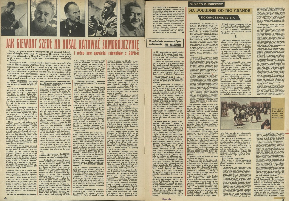Archiwum / Społeczeństwo nr 1265 (27/1969) 51960/123969 Podziel się Tytuł Jak Giewont szedł na Nosal ratować samobójczynię Autor Jan Kalkowski Kategoria Społeczeństwo Artykuł z numeru 1265 (27/1969) Data wydania 6 lipca 1969