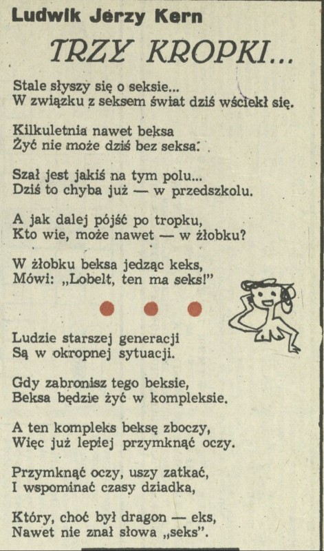 Archiwum / Rozmaitości [old] nr 1194 (08/1968) 11/57 Podziel się Tytuł Trzy kropki... Autor Ludwik Jerzy Kern Rubryka Rozmaitości [old] Artykuł z numeru 1194 (8/1968) Data wydania 25 lutego 1968