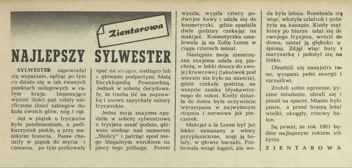 Archiwum / Felieton nr 823 (03/1961) 33973/123969 Podziel się Tytuł Najlepszy sylwester Autor Maria Zientarowa Kategoria Felieton Artykuł z numeru 823 (3/1961) Data wydania 15 stycznia 1961