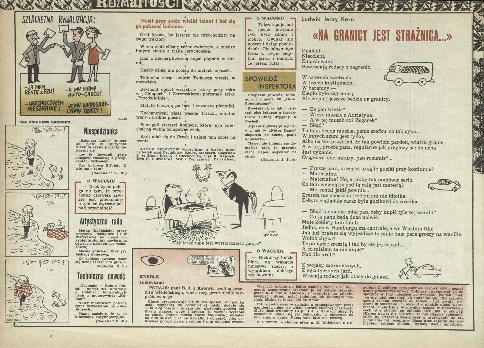Archiwum / Rozmaitości [old] nr 1273 (35/1969) 34/52 Podziel się Tytuł „Na granicy jest strażnica..” Autor Ludwik Jerzy Kern Rubryka Rozmaitości [old] Artykuł z numeru 1273 (35/1969) Data wydania 31 sierpnia 1969