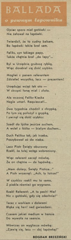 Archiwum / Poezja nr 22 (22/1945) 29/6270 Podziel się Tytuł Ballada o pewnym łapowniku Autor Bogdan Brzeziński Kategoria Poezja Artykuł z numeru 22 (22/1945) Data wydania 9 września 1945