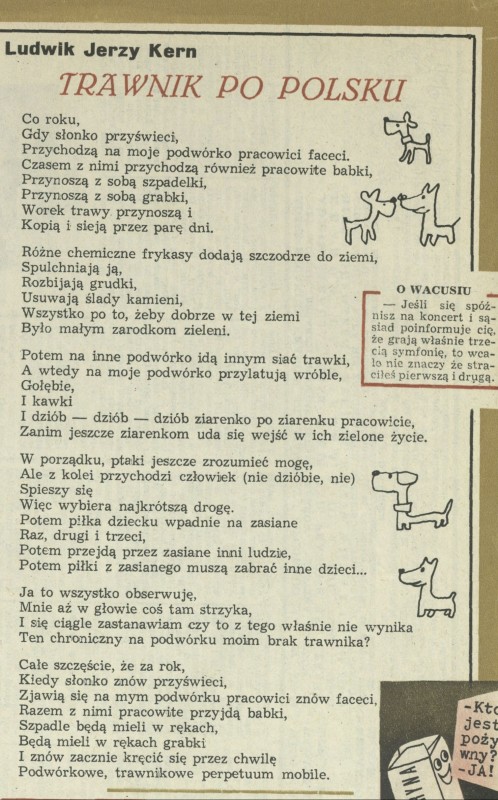 Archiwum / Poezja nr 1202 (16/1968) 33/47 Podziel się Tytuł Trawnik po polsku Autor Ludwik Jerzy Kern Kategoria Poezja Artykuł z numeru 1202 (16/1968) Data wydania 21 kwietnia 1968