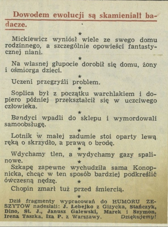 Archiwum / Humor zeszytów szkolnych nr 1202 (16/1968) 336/409 Podziel się Tytuł Humor zeszytów Rubryka Humor zeszytów szkolnych Artykuł z numeru 1202 (16/1968) Data wydania 21 kwietnia 1968