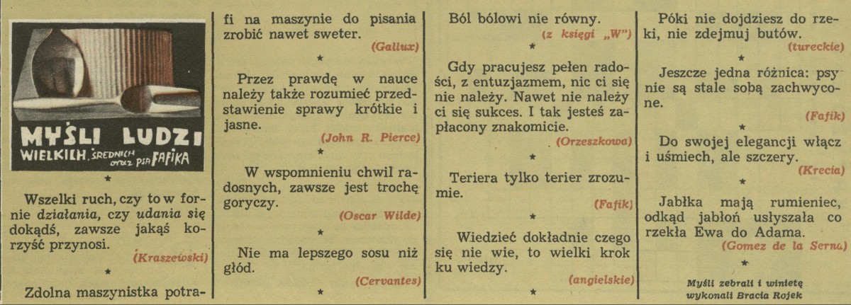 Archiwum / Myśli nr 1205 (19/1968) 50081/123969 Podziel się Tytuł Myśli ludzi wielkich, średnich i psa Fafika Autor Bracia Rojek Rubryka Myśli Artykuł z numeru 1205 (19/1968) Data wydania 12 maja 1968
