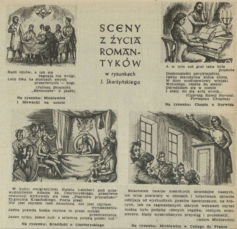 Archiwum / Rysunek nr 555 (48/1955) 85/121 Podziel się Tytuł Sceny z życia romantyków Autor Jerzy Skarżyński Kategoria Rysunek Artykuł z numeru 555 (48/1955) Data wydania 27 listopada 1955 Tagi Mickiewicz i Slowacki na uczcie Krasiński u Czartoryskiego Chopin u Norwida Mickiewicz w College de france