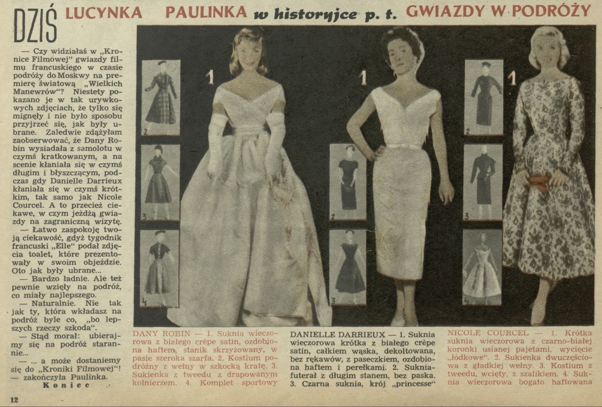 Archiwum / Dziś Lucynka i Paulinka nr 555 (48/1955) 34/128 Podziel się Tytuł Gwiazdy w podróży Autor Lucynka i Paulinka Rubryka Dziś Lucynka i Paulinka Artykuł z numeru 555 (48/1955) Data wydania 27 listopada 1955 Tagi film aktorka Dany Robyn Danielle Darrieux Nicole Courcel sukienka suknia