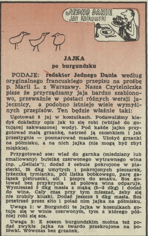 Archiwum / Jedno danie nr 1207 (21/1968) 24/55 Podziel się Tytuł Jajka po burgundzku Autor Jan Kalkowski Rubryka Jedno danie Artykuł z numeru 1207 (21/1968) Data wydania 26 maja 1968
