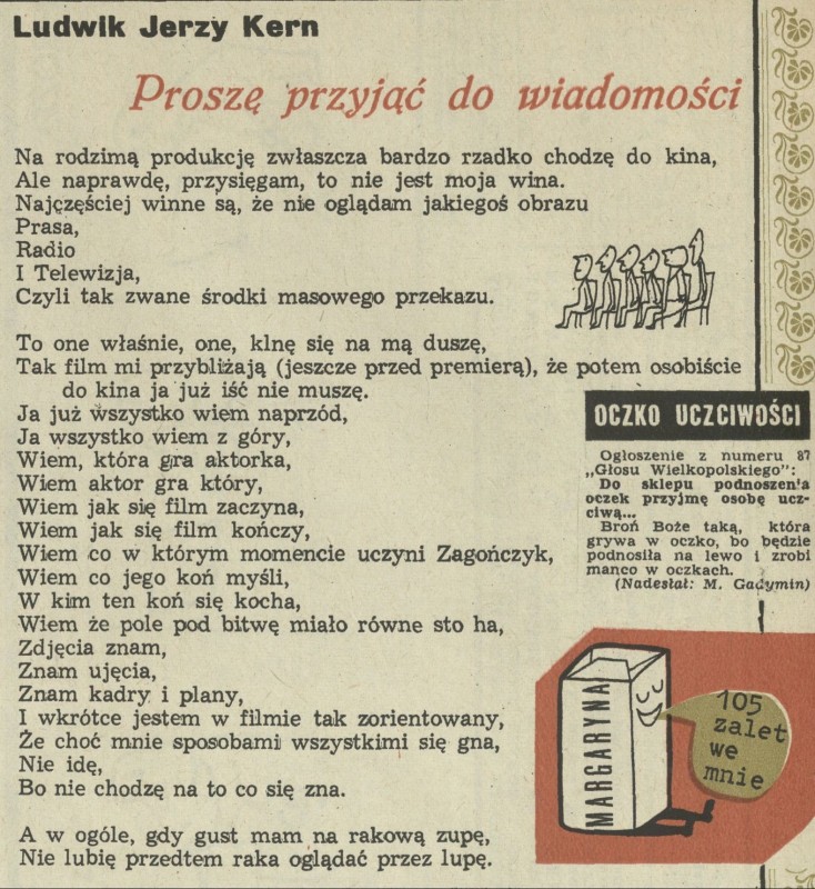 Archiwum / Rozmaitości [old] nr 1204 (18/1968) 65/226 Podziel się Tytuł Proszę przyjąć do wiadomości Autor Ludwik Jerzy Kern Rubryka Rozmaitości [old] Artykuł z numeru 1204 (18/1968) Data wydania 5 maja 1968