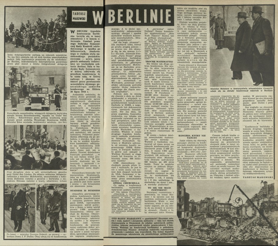 Archiwum / Przekrój tygodnia nr 462 (07/1954) 2/7 Podziel się Tytuł W Berlinie Autor Tadeusz Makowski Rubryka Przekrój tygodnia Artykuł z numeru 462 (7/1954) Data wydania 14 lutego 1954 Tagi polityka Dulles Mołotow Konferencja Czterech Konferenscja Berlińska