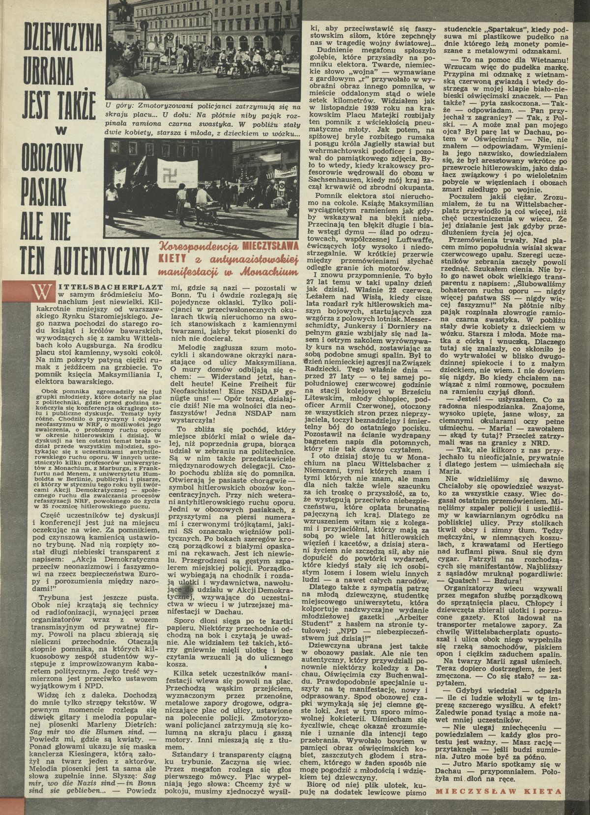 Archiwum / Społeczeństwo nr 1214 (28/1968) 50415/123969 Podziel się Tytuł Korespondencja Mieczysława Kiety z antynazistowskiej manifestacji w Monachium Autor Mieczysław Kieta Kategoria Społeczeństwo Artykuł z numeru 1214 (28/1968) Data wydania 14 lipca 1968