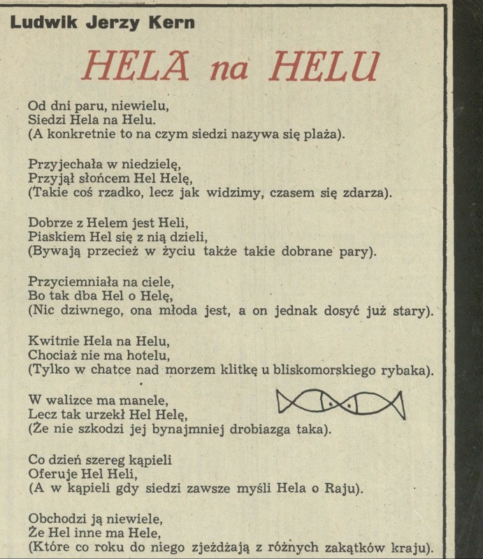 Archiwum / Poezja nr 1215 (29/1968) 50474/123969 Podziel się Tytuł Hela na Helu Autor Ludwik Jerzy Kern Kategoria Poezja Artykuł z numeru 1215 (29/1968) Data wydania 22 lipca 1968