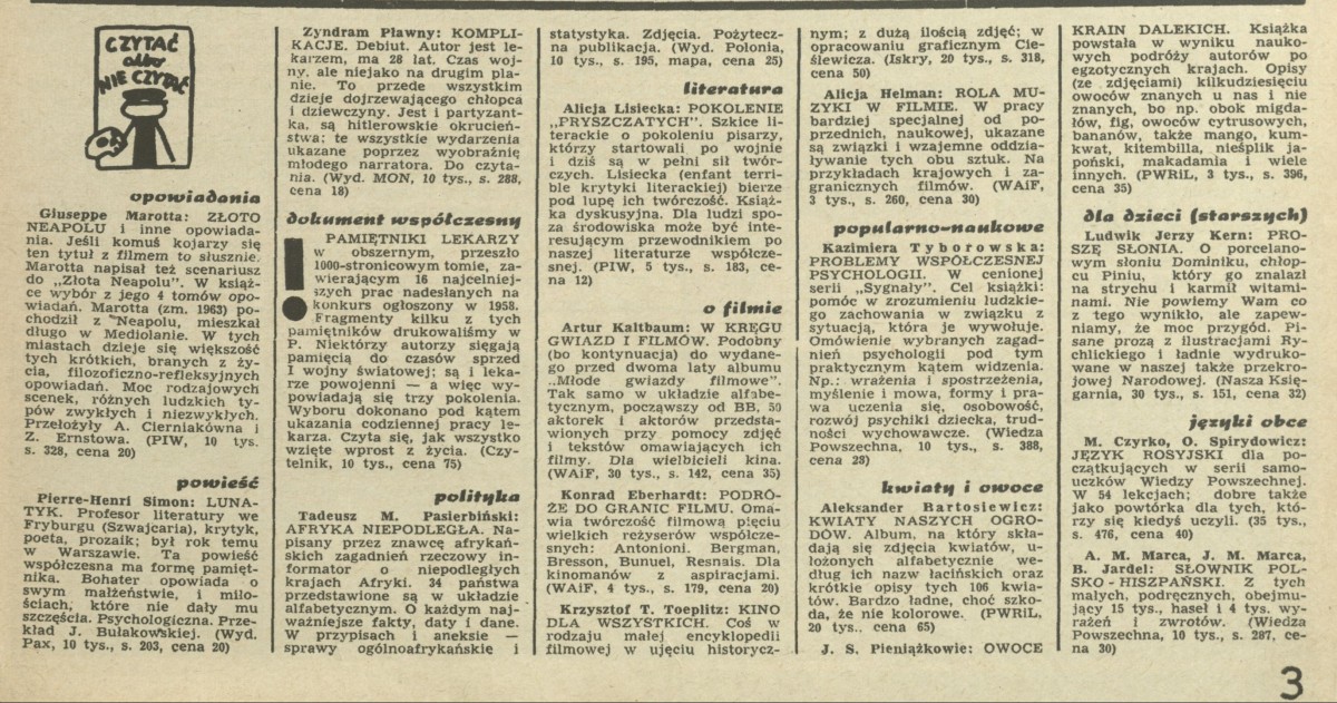 Archiwum / Czytać albo nie czytać? nr 1034 (05/1965) 242/481 Podziel się Tytuł Czytać albo nie czytać? Rubryka Czytać albo nie czytać? Artykuł z numeru 1034 (5/1965) Data wydania 31 stycznia 1965
