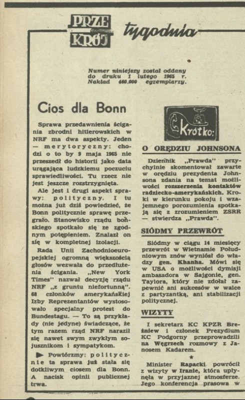 Archiwum / Przekrój tygodnia nr 1035 (06/1965) 44/65 Podziel się Tytuł Przekrój tygodnia Rubryka Przekrój tygodnia Artykuł z numeru 1035 (6/1965) Data wydania 7 lutego 1965 Tagi cios Bonn