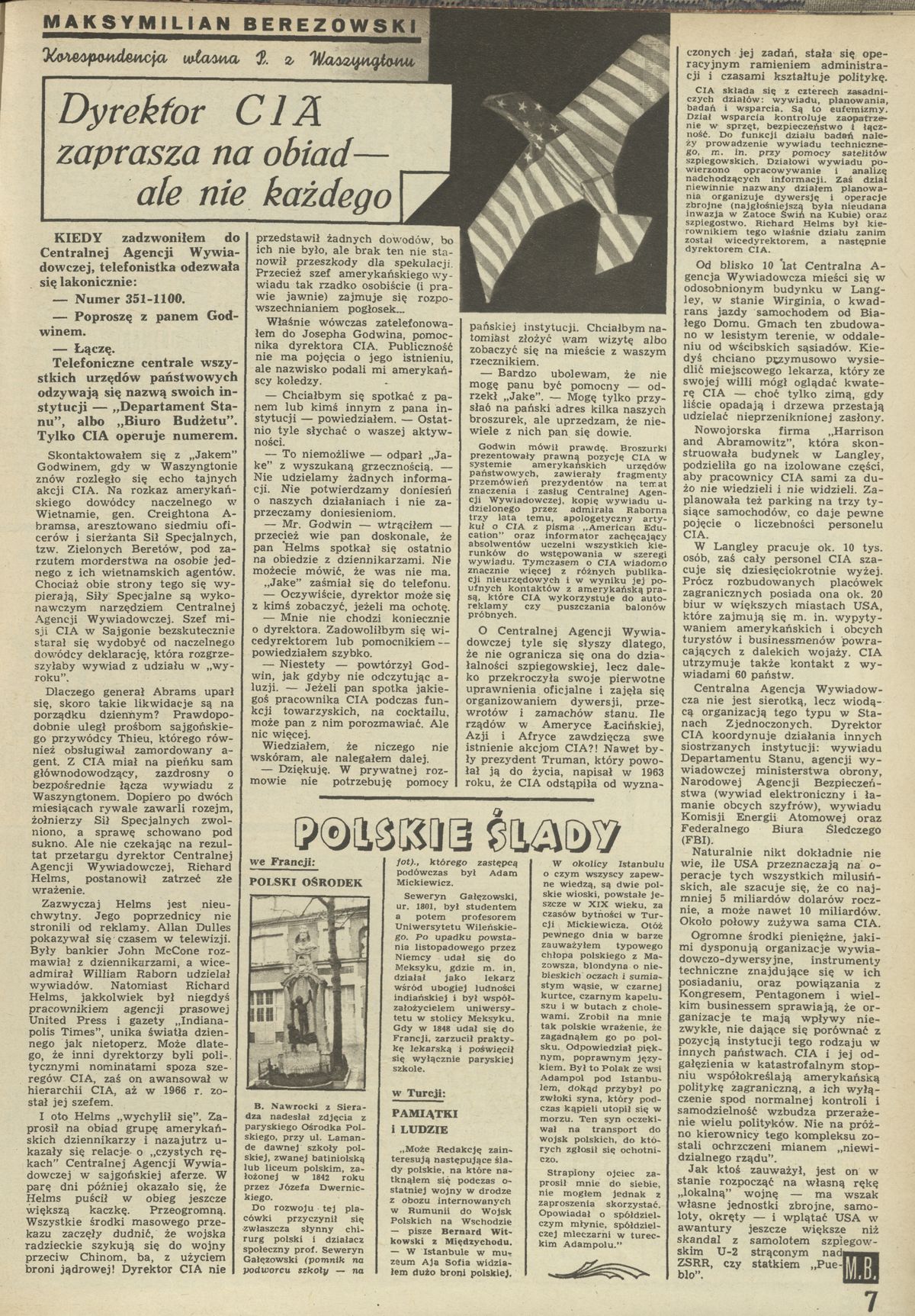 Archiwum / korespondencja własna "Przekroju" nr 1286 (48/1969) 31/45 Podziel się Tytuł Dyrektor CIA zaprasza na obiad - ale nie każdego Autor Maksymilian Berezowski Rubryka korespondencja własna "Przekroju" Artykuł z numeru 1286 (48/1969) Data wydania 30 listopada 1969