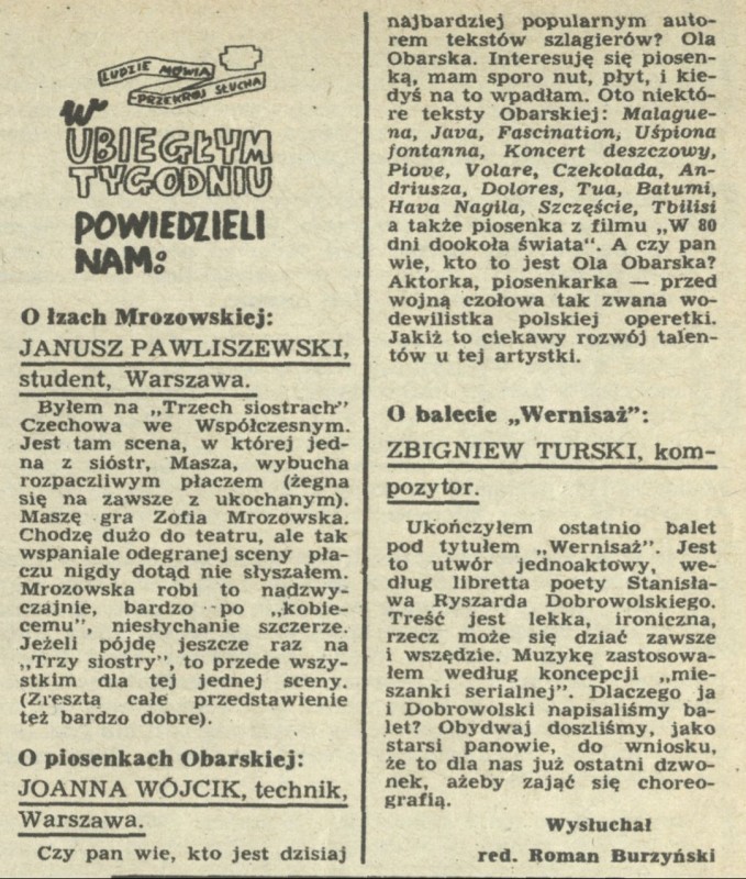 Archiwum / W ubiegłym tygodniu powiedzieli nam nr 937 (12/1963) 89/158 Podziel się Tytuł W ubiegłym tygodniu powiedzieli nam Autor Roman Burzyński Rubryka W ubiegłym tygodniu powiedzieli nam Artykuł z numeru 937 (12/1963) Data wydania 24 marca 1963 Tagi piosenki Oli Obarskiej balet różności