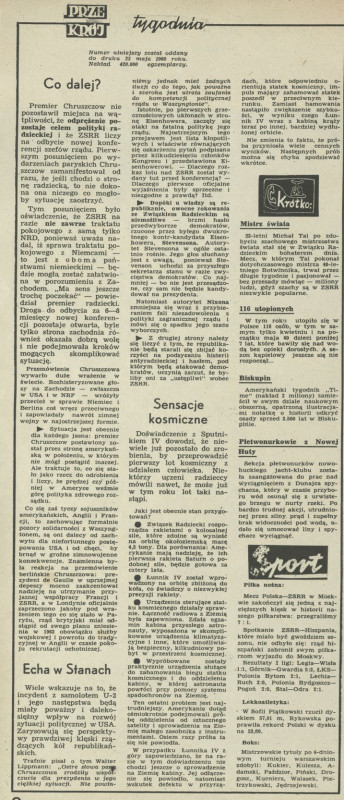 Archiwum / Przekrój tygodnia nr 790 (22/1960) 04/69 Podziel się Tytuł Przekrój tygodnia Rubryka Przekrój tygodnia Artykuł z numeru 790 (22/1960) Data wydania 29 maja 1960 Tagi polityka kosmos zsrr