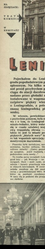 Archiwum / korespondencja własna "Przekroju" nr 938 (13/1963) 107/438 Podziel się Tytuł Leningrad Autor Roman Burzyński Rubryka korespondencja własna "Przekroju" Artykuł z numeru 938 (13/1963) Data wydania 31 marca 1963 Tagi Ermitaż Leningrad balet Don Kichot