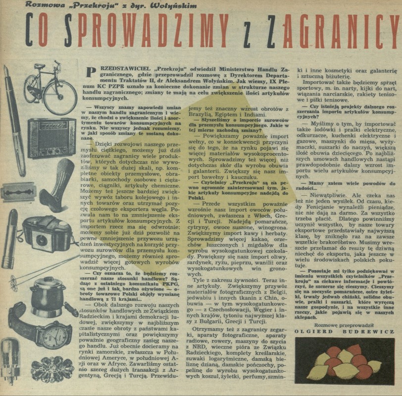 Archiwum / Rozmowy „Przekroju” nr 463 (08/1954) 18/22 Podziel się Tytuł Rozmowa Przekroju z dyr. Wołyńskim. Co sprowadzimy z zagranicy Autor Olgierd Budrewicz Rubryka Rozmowy „Przekroju” Artykuł z numeru 463 (8/1954) Data wydania 21 lutego 1954 Tagi Ministerstwo Hanglu Zagranicznego konsumpcja produkty artykuły import