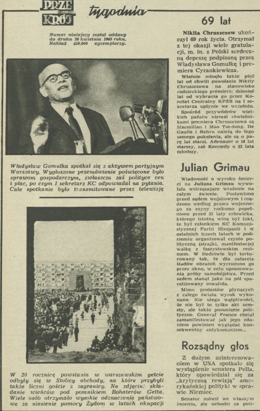 Archiwum / Przekrój tygodnia nr 942 (17/1963) 13312/21410 Podziel się Tytuł Przekrój Tygodnia Rubryka Przekrój tygodnia Artykuł z numeru 942 (17/1963) Data wydania 28 kwietnia 1963 Tagi Gomułka Chruszczow wyrok śmierci