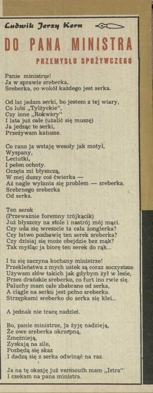 Archiwum / Rozmaitości [old] nr 1037 (08/1965) 08/54 Podziel się Tytuł Do pana ministra Autor Ludwik Jerzy Kern Rubryka Rozmaitości [old] Artykuł z numeru 1037 (8/1965) Data wydania 21 lutego 1965
