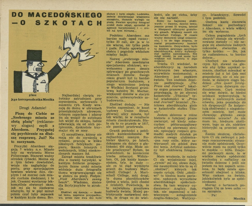 Archiwum / korespondencja własna "Przekroju" nr 1040 (11/1965) 1/1 Podziel się Tytuł Do Macedońskiego o Szkotach Rubryka korespondencja własna "Przekroju" Artykuł z numeru 1040 (11/1965) Data wydania 14 marca 1965