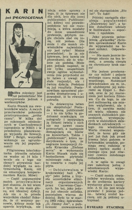 Archiwum / Kultura nr 1040 (11/1965) 64/182 Podziel się Tytuł Karin już pełnoletnia Autor Ryszard Stachnik Kategoria Kultura Artykuł z numeru 1040 (11/1965) Data wydania 14 marca 1965 Tagi debiut Stanek