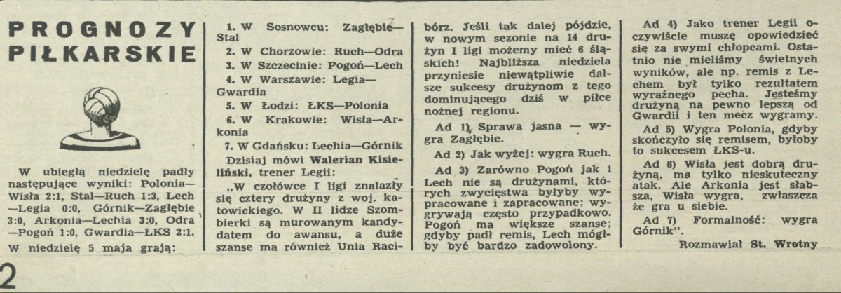 Archiwum / Piłkarskie prognozy nr 943 (18/1963) 65/262 Podziel się Tytuł Prognozy piłkarskie Autor Stanisław Wrotny Rubryka Piłkarskie prognozy Artykuł z numeru 943 (18/1963) Data wydania 5 maja 1963 Tagi piłka nożna prognozy mecze