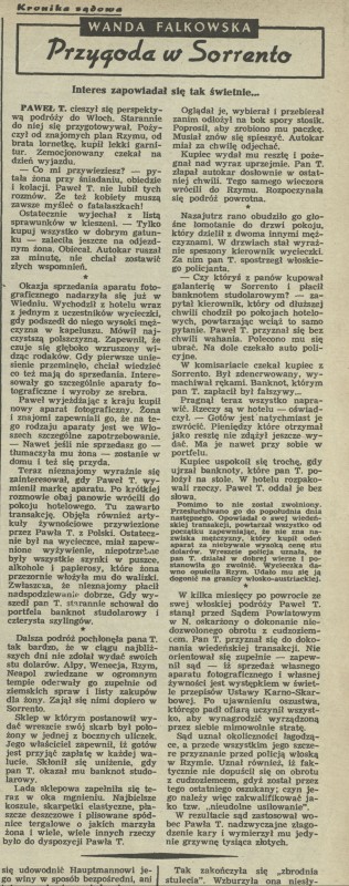 Archiwum / Kronika sądowa nr 946 (21/1963) 1/3 Podziel się Tytuł Kronika sądowa: przygoda w Sorrento Autor Wanda Falkowska Rubryka Kronika sądowa Artykuł z numeru 946 (21/1963) Data wydania 26 maja 1963 Tagi Sorrento transakcja