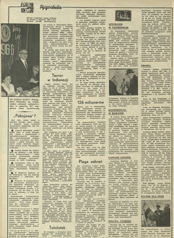 Archiwum / Przekrój tygodnia nr 1083 (02/1966) 14/23 Podziel się Tytuł Przekrój tygodnia Rubryka Przekrój tygodnia Artykuł z numeru 1083 (2/1966) Data wydania 9 stycznia 1966 Tagi Gomułka Harriman Papież Paweł VI Wietnam Komunistyczna Partia Indonezji Totolotek zebrania