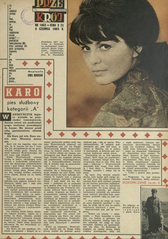 Archiwum / Okładki Przekroju nr 1052 (23/1965) 299/626 Podziel się Tytuł Karo - pies służbowy kategorii A Autor Ewa Kossak Rubryka Okładki Przekroju Artykuł z numeru 1052 (23/1965) Data wydania 6 czerwca 1965