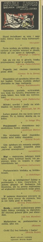 Archiwum / Myśli nr 713 (49/1958) 55/55 Podziel się Tytuł Myśli ludzi wielkich, średnich oraz psa Fafika Autor Bracia Rojek Rubryka Myśli Artykuł z numeru 713 (49/1958) Data wydania 7 grudnia 1958