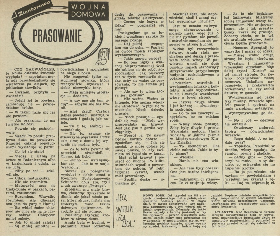 Archiwum / Proza nr 1052 (23/1965) 06/10 Podziel się Tytuł Wojna domowa: prasowanie Autor Maria Zientarowa Kategoria Proza Artykuł z numeru 1052 (23/1965) Data wydania 6 czerwca 1965