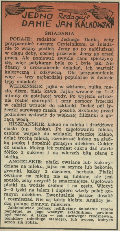Archiwum / Jedno danie nr 1052 (23/1965) 27/57 Podziel się Tytuł Śniadania Autor Jan Kalkowski Rubryka Jedno danie Artykuł z numeru 1052 (23/1965) Data wydania 6 czerwca 1965 Tagi gastronomia kulinaria przepis kulinarny śniadanie wiedeńskie śniadanie hiszpańskie śniadanie angielskie