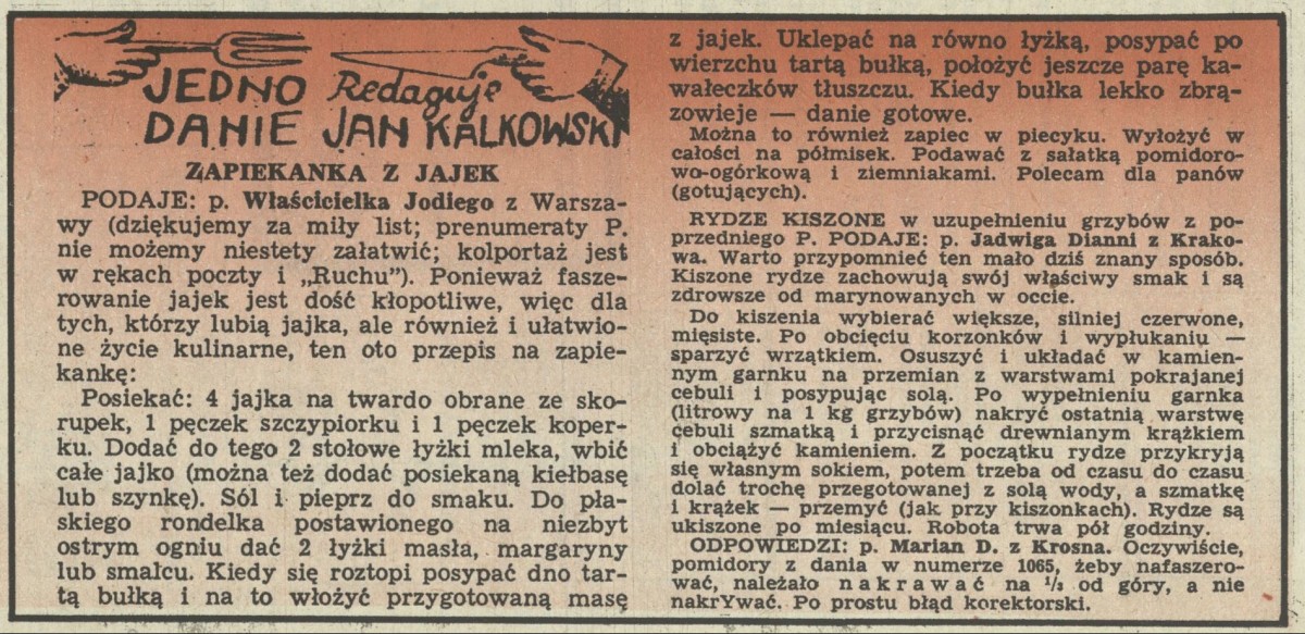 Archiwum / Jedno danie nr 1067 (38/1965) 19/55 Podziel się Tytuł Zapiekanka z jajek Autor Jan Kalkowski Rubryka Jedno danie Artykuł z numeru 1067 (38/1965) Data wydania 19 października 1965 Tagi gastronomia kulinaria przepis kulinarny zapiekanka jajka grzyby rydze kiszone